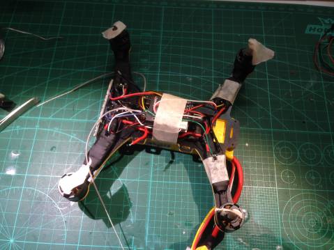Für die Hallenflugsaison 2015 brachte ich noch einen kleinen Copter der durch Räder links und rechts zum Fungerät werden soll. Dafür hab ich den Afro 170 von Johannes nachgebaut, abweichend bekommt er keine obere Abdeckplatte aus GFK sondern ein 3D Druckteil, an dem man einen Halter für eine Achse anbringen kann. So kann man wie beim Parrot Rolling Spider auch sich durch die Gegend kugeln oder Wände hoch fahren, ohne die Propeller zu zerstören.